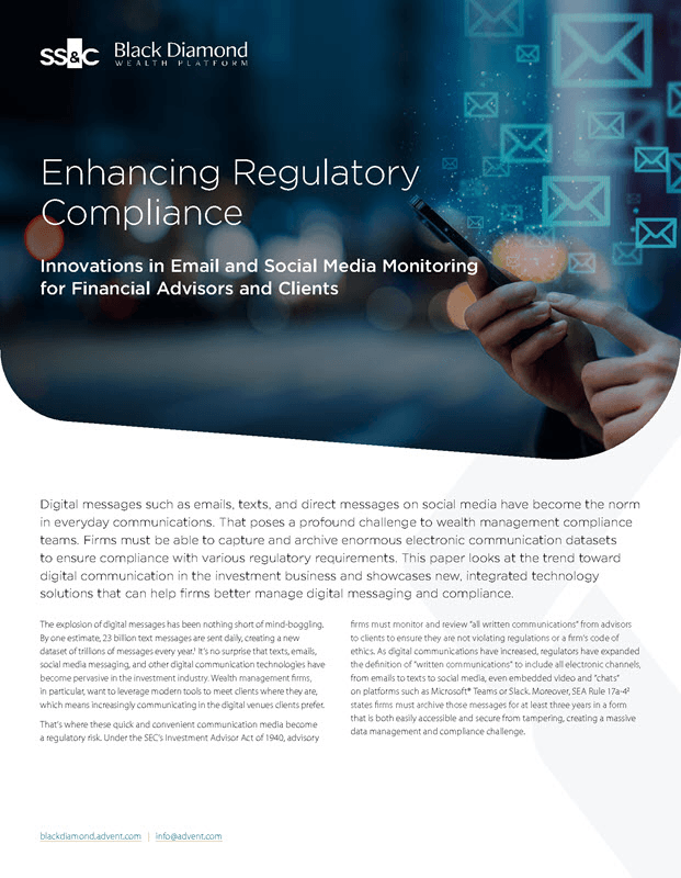 Digital messages such as emails, texts, and direct messages on social media have become the norm in everyday communications. That poses a profound challenge to wealth management compliance teams. Firms must be able to capture and archive enormous electronic communication datasets to ensure compliance with various regulatory requirements. This paper looks at the trend toward digital communication in the investment business and showcases new, integrated technology solutions that can help firms better manage digital messaging and compliance.