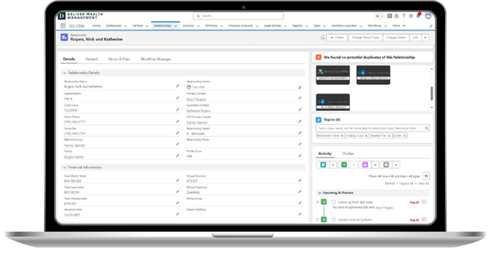 Access Black Diamond client relationship, portfolio, and account data via a streamlined installation. Rapid deployment and updates ensure seamless integration with custodians and portfolio management, keeping your CRM always up to date.