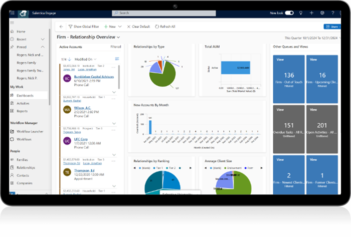 Engage is a highly configurable CRM platform that harnesses the full power of Microsoft Dynamics 365, providing an advisor-centric CRM experience designed specifically for your firm. Leverage Microsoft's natively integrated ecosystem to help advisors grow relationships with ease.